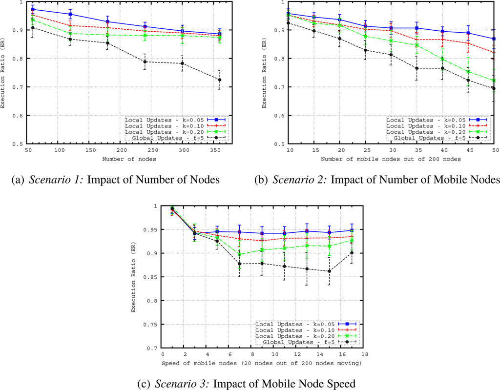 In Figure 11(a), we evaluate execution ratios (ERs) of different f values when we increase the number of nodes and the number of mobile nodes in the network. We observe that increase in number of nodes and number of mobile nodes in the network results in decreases of ERs for different global update frequencies. The best ER is obtained when f = 5. Although global updating every 3 seconds refreshes the tree structure more frequently, the drop in the ER of f = 3 is very large when we increase the number of nodes. This is mainly due to the overlapping of global updates. Overlapping means that before finishing one global updating, the next one starts. The overlapping time gets longer when we have more nodes in the network. Therefore, for bigger network sizes 3 seconds is not enough to finish one global update. For instance, for a network having 360 nodes, it takes around 3.75 seconds to finish one global update. For other f values bigger than 5, ER is worse than ER of f = 5 for the given network sizes. It is important to point out that for networks bigger that 360 nodes, 5 seconds may also not be enough to finish one global update. However, it is the best frequency for the range of network sizes we consider here.
