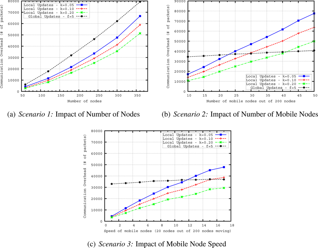 As we observed from the simulation results, local updates perform very well in terms of ER; on the other hand, local updating is much more energy efficient than global updating in networks having any number of nodes, but, small number of mobile nodes (i.e., around 10–15% of the number of nodes) moving with a speed varying from low to high (i.e., around 1–20 m/s). This specification is very much valid for mostly static sensor network scenarios in which most of the sensors are static and some sensors are attached to people or vehicles such as firefighters or firetrucks, unmanned aerial vehicles (UAVs) moving at low or medium velocities in an Emergency Response Application.