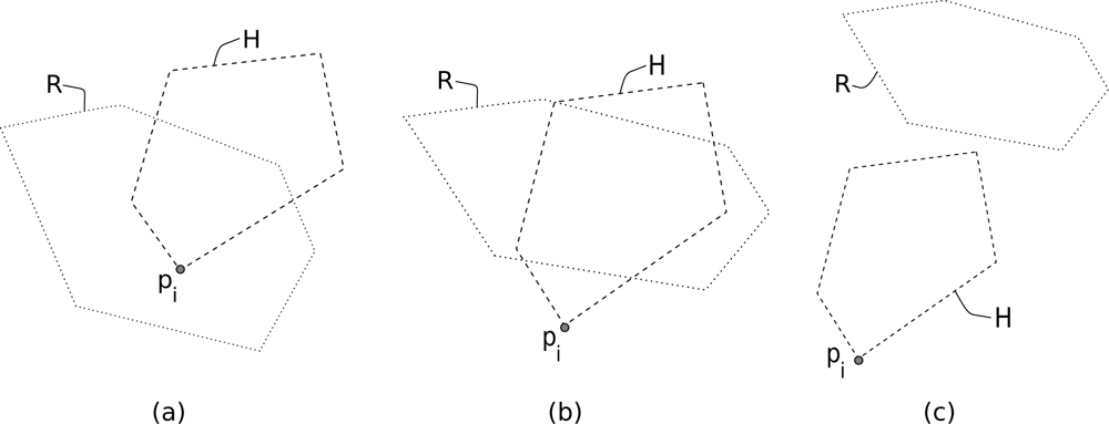 The forwarding decision is taken based upon R extracted from the query and the local coverage area Hi. Checking if R overlaps with Hi (i.e., determining if two convex polygons intersect) can be easily performed in (log (m + n)) as described in [32], where m and n are the numbers of vertexes of the two polygons, respectively. We assume that the target region is a circle in our simulations. Checking if circle R overlaps with Hi is done by “partially” checking the circle against edges [33], and against vertexes. If the area of interest and the local coverage area intersect, the node forwards the query (see Figure 2(b)). Otherwise, it halts the forwarding of the query (see Figure 2(c)).