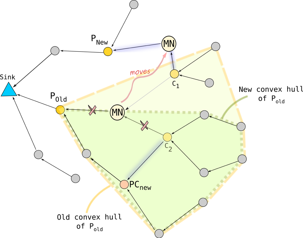 When a mobile node ( MN) moves from one location to another, it may change its neighborhood, including its parent and child nodes. As result of mobility, the child nodes of the MN may need to re-associate themselves to another parent node and/or the MN may need to re-associate itself to a new parent node. Figure 3 shows an example of nodes and local convex hulls that are affected by the mobility of a node. MN and one of the child nodes (i.e., C2) have to associate themselves with new parent nodes (i.e., PNew and PCnew) after the movement of MN. Also, the convex hulls of new parent nodes (i.e., PNew and PCnew), and old parent nodes (i.e., Pold and MN) change due to mobility. In the following we explain how to detect these changes by the neighbors of MN and how to update accordingly the tree and the convex hulls of the affected nodes.