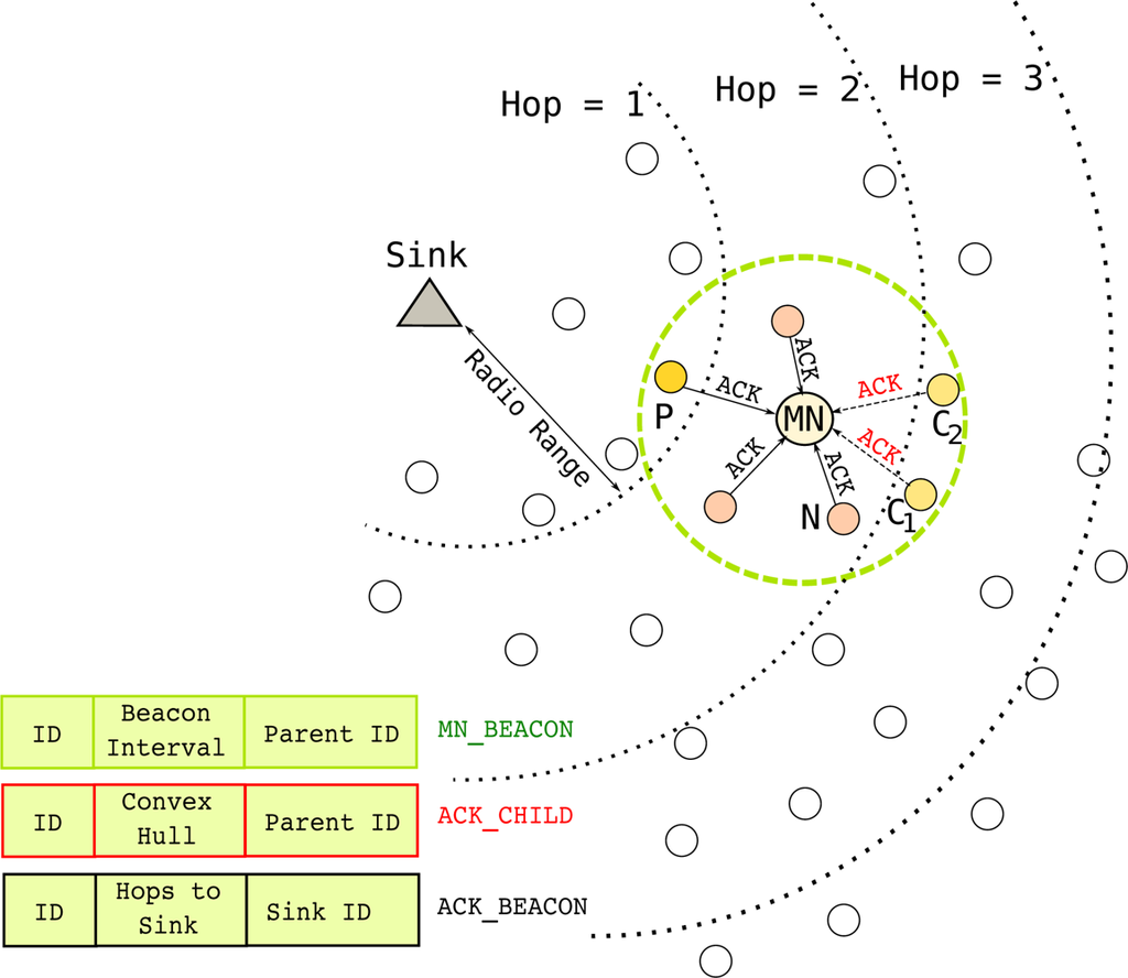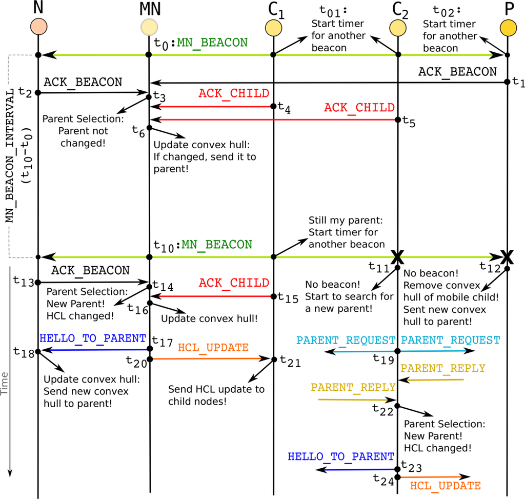 Messaging during the local updates is illustrated in Figure 5. In the figure, MN broadcasts a MN_BEACON packet at time t0. The receivers of a beacon packet first check who sent the beacon. The receiver node can be (i) the parent node P of MN, or (ii) a regular neighboring node N of MN, or (iii) a child node C of MN. Every node that receives a MN_BEACON packet sends an acknowledgement (i.e., ACK) message back to MN initiating the beaconing as shown in Figure 4. However, the content of the acknowledgement message is determined by the relationship between MN and the receiver node: