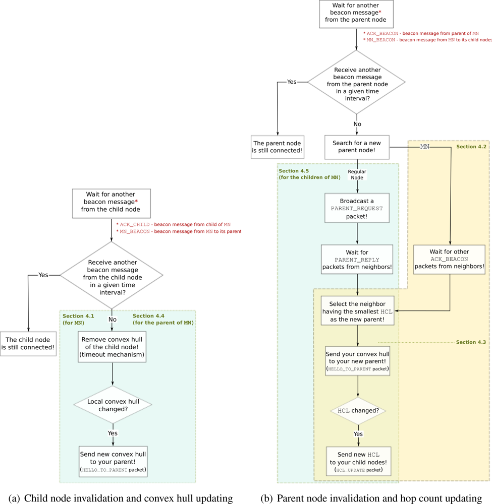 After waiting for ACK packets from its neighbors, MN executes the following actions: (i) If MN does not get an ACK from a child node, it updates its convex hull and propagates the changes up on the tree (child node invalidation, see Figure 6(a)), and (ii) If MN does not get an ACK from its previous parent node, it selects a new parent and propagates the convex hull up and the new hop count level down the tree after new parent selection (parent node invalidation, see Figure 6(b)).