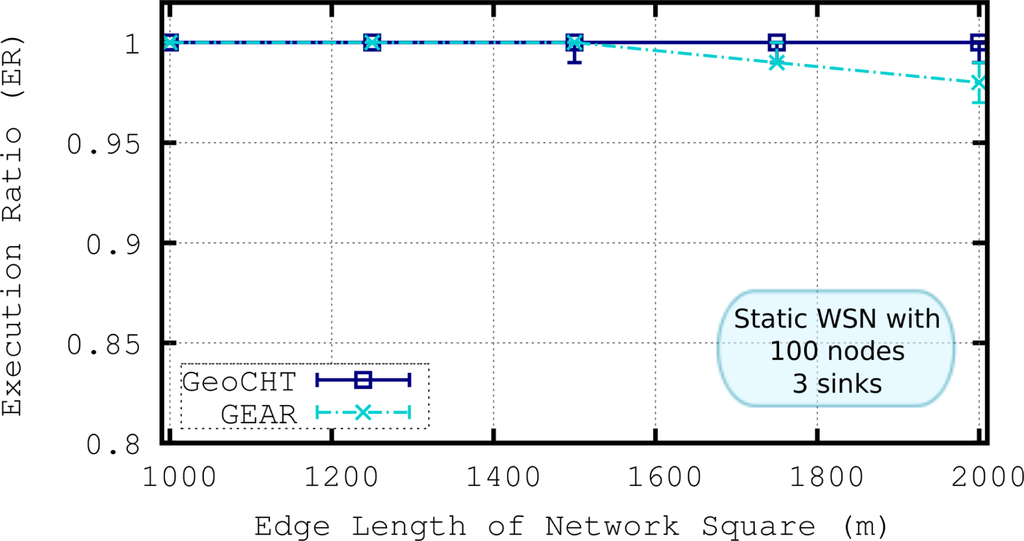 Execution ratio (ER)—The ratio of nodes that are within the region of interest and execute the query with the total number of nodes within the region of interest. This metric measures how well the routing is able to deliver the query to the region of interest. It is defined to evaluate routing accuracy of queries in mobile WSN.