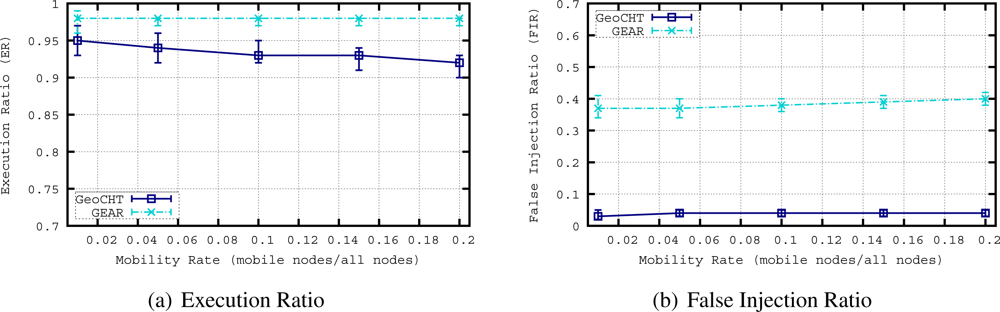 The performance of the GeoCHT and GEAR is evaluated and compared in both static and mobile scenarios in our previous work [6]. The details of the GEAR protocol can be found in Section 2.2. In this section, we briefly summarize the results of this comparison to show the efficiency of GeoCHT. The simulation results show that GeoCHT performs quite well in static scenarios. AQDD and NL of GeoCHT are much lower than GEAR while GeoCHT has higher ER and lower FIR in most of the cases. Figure 7 shows the comparison of ERs of GeoCHT and GEAR in a static WSN with varying density. Note that an execution ratio of 1 means that every node inside the target region has received and executed the corresponding query packet. Since we focus on the mobile WSNs in this work, we present the comparison of GeoCHT and GEAR in a mobile scenario in the following discussion.
