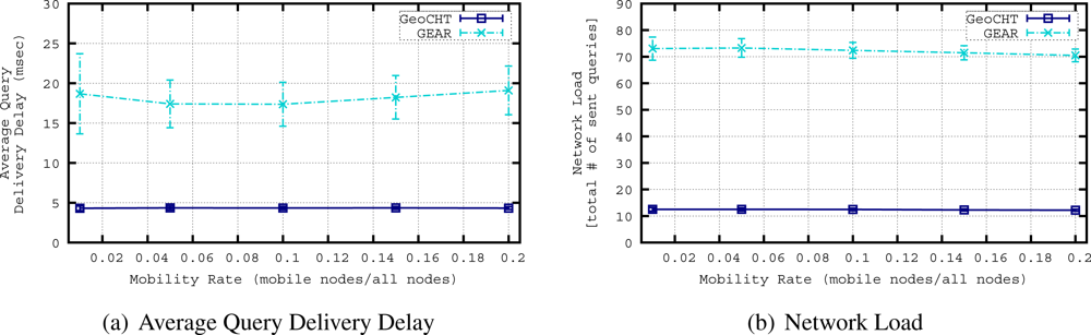 Figure 9 shows the networking performance of the protocols. In Figure 9(a), we show the query delivery delays of both protocols. The delays are not affected much by the increasing number of mobile nodes in the network. The delay in GeoCHT is smaller than the delay of GEAR because GeoCHT discards the queries of sinks which are very far from the area of interest. Only the sinks that are close to the area of interest inject their queries; however, in GEAR, even if a sink is very far from the target region, it still injects its query so the average query delivery delay of GEAR is getting higher. Another reason of this difference in delays of GEAR and GeoCHT is their different forwarding mechanisms. GEAR uses unicasting to reach next hop but GeoCHT uses a special restricted broadcasting (i.e., multicasting) which is quicker in the delivery of the message to the next node. The network load of GEAR and GeoCHT are shown in Figure 9(b). The network load of GEAR is higher than the network load of GeoCHT in this mobile scenario. The network load of GEAR is slightly decreasing when we increase the number of mobile nodes since for a node, the probability of changing its neighborhood is getting higher so the query packet can get stuck at a node which does not have a neighbor that is closer to the area of interest anymore. Therefore, the number of sent query packets decreases in GEAR.
