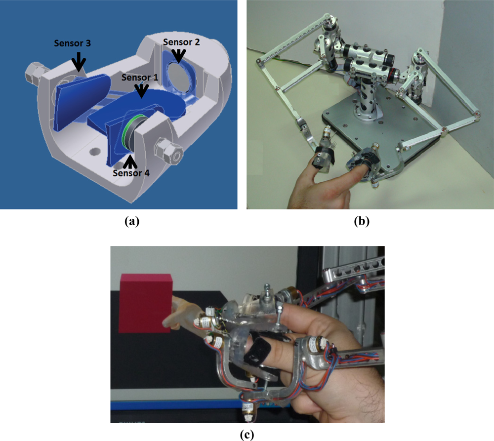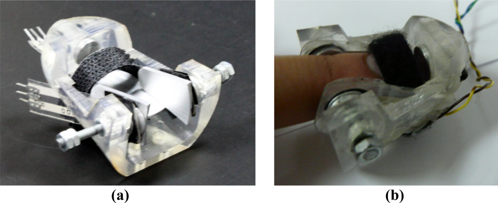 The thimble includes four Flexiforce contact force sensors manufactured by Tekscan Inc. []. These sensors are used for estimating normal and tangential forces at the fingertip. Contact force sensors only provide the normal component force applied to its active area. Sensors are located in the thimble, thereby enabling the measurement of normal and tangential manipulation. Normal manipulation force is provided by the sensor located in the fingertip, as shown by the “Sensor 1” label in Figure 2. Three additional sensors are placed on the sides of the phalanx in order to estimate the tangential manipulation force. These sensors are labeled as “Sensor 2”, “Sensor 3”, and “Sensor 4” in Figure 2. This thimble is designed to fit a particular haptic device. Figure 2(b) shows how the thimble is attached to a two-finger haptic device called the MasterFinger-2 [] by means of a screw system.