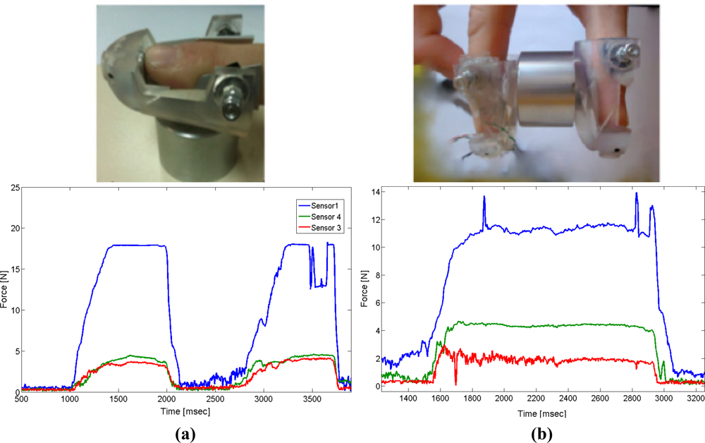 The effect is illustrated in Figure 3(a): a cylinder weighing 4.5 N was used to show forces caused by finger deformations within the thimble. The user applies a normal force to a rigid surface. Consequently, sensors 2 and 3 measure similar forces resulting from the symmetric deformation of the finger. In Figure 3(b), the cylinder is grasped horizontally using two thimbles. The sensor located under the fingertip measures the normal force that is applied to hold the cylinder, whereas the tangential force is estimated by the sensor located at the upper sides of the finger and equal half of the total weight of the cylinder, since two thimbles are used. The data provided by the sensors is shown in Figure 3(b). The highest force value is the one measured by sensor 1 (corresponding to the normal force exerted by the user). The subtraction of the two measurements from the lateral sensors represents the real tangential force. The total weight obtained is 4.3 − 2.0 = 2.3 N, which is a close approximation to half of the cylinder’s weight. Thus, the measurement provided by the contact force sensor with this configuration represents a close approximation to the expected value.