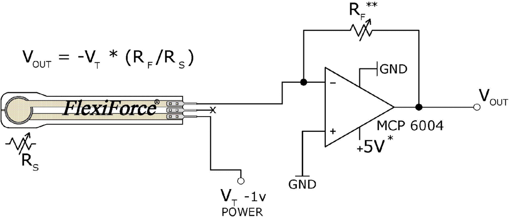 A A201-25 Flexiforce sensor from Tekscan [] with a range of 0 to 110 N was selected. The thickness of the sensor is approximately 0.2 mm and is very lightweight. According to the manufacturer specifications, the repeatability is ±2.5%. The active area of this sensor consists of an ultra-thin and flexible printed circuit located in a circle with a 9.53 mm diameter. Its behavior is similar to a variable resistor. When the sensor is unloaded, its resistance is very high (greater than 5 MΩ). This resistance decreases when force is applied to the active sensor area. The electronic circuit recommended by the manufacturer is shown in Figure 4.