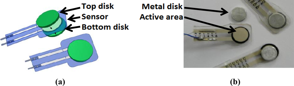 The applied force must be homogeneously exerted over the active sensing area in order to guarantee proper sensor repeatability. For this reason, a “sandwich configuration” mechanical assembly was used to properly transmit forces to the sensor’s active area. This mounting consists in placing the sensor in the middle of two cylindrical metal sheets that are located over the active sensor area, as shown in Figure 5(a). The cylindrical metal sheets must have a very flat surface in order to obtain proper repeatability. This “sandwich configuration” guarantees mechanical isolation between the finger and the thimble, since the user force is thoroughly transmitted to the sensor. This configuration has been successfully tested and used in many experiments.