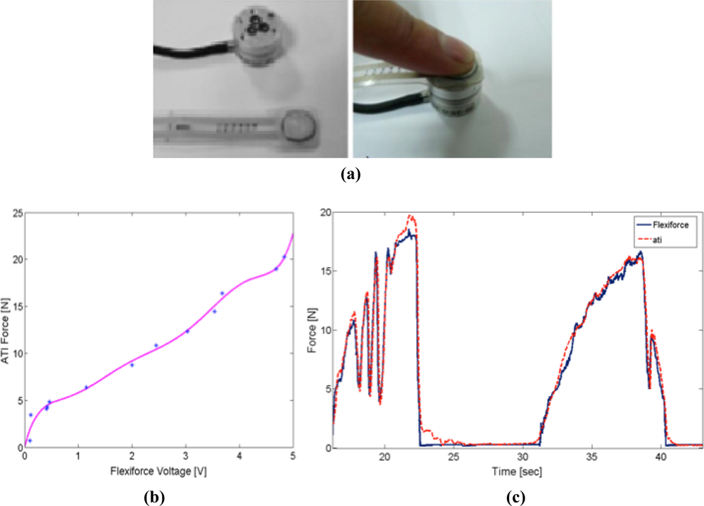 Force/torque transducers or load cells are usually used to obtain these types of measurements []. These devices are very precise; however, they have inconveniences, mainly related to their weight, volume, and high cost. The project developed in this paper focuses on using contact force sensors to estimate manipulation forces. Specifically, the contact force sensors referred to in this paper are FlexiForce model A201 by Tekscan Inc. This type of sensor acts as a force-sensing resistor, such that when the force sensor is unloaded, its resistance is very high, and when force is applied to the sensor, this resistance decreases. Several types of material show this kind of behavior, from metals to semiconductors []. The principle drawbacks of these sensors relate to low repeatability and hysteresis. Nevertheless, contact force sensors and piezoresistive sensors provide an effective solution for varying kinds of applications. Examples include: the detection of collisions in human-robot interaction [], the measurement of manipulation forces [–], biomedical applications [,], and minimally invasive surgery [] due to the sensors’ highly reduced size, weight, and cost. This paper proposes the design of an end-effector for haptic devices that incorporates contact force sensors in order to estimate manipulation forces when interacting with virtual or real environments.