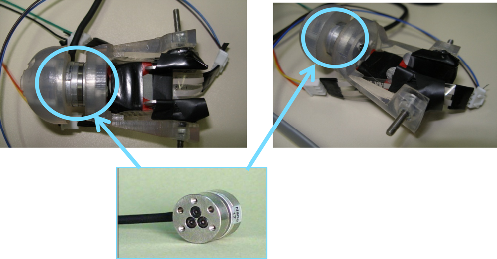 The second previously mentioned requirement refers to the design of a thimble that is as light as possible. As we mentioned earlier, the thimble is located at the end-point of the device; therefore a minor additional weight could significantly increase the inertia (proportional to the square of the distance). In haptic interfaces, high inertia can lead to a dynamic distortion of the user’s perception [,]. This is the main reason why contact force sensors were considered in this design as opposed to traditional load cells. A load cell consists of a gauge inside a metal case, which results in a heavy and bulky design.