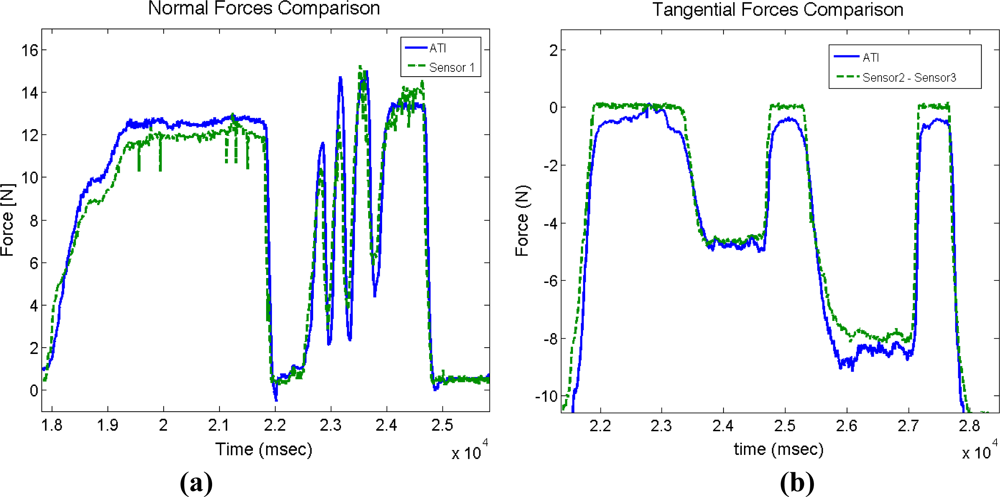 The standard deviation of the difference between both derivatives is equal to ±0.166 N/s. Consequently, the estimation of manipulation force flanks is much more precise than the estimation of normal and tangential forces. As shown in Figure 8, it can be observed that when forces vary, the flanks of the signals measured by the thimble and the corresponding signals provided by the ATI-Nano17 are very similar. This information may be useful for some applications such as task segmentation, event or contact detection, etc.