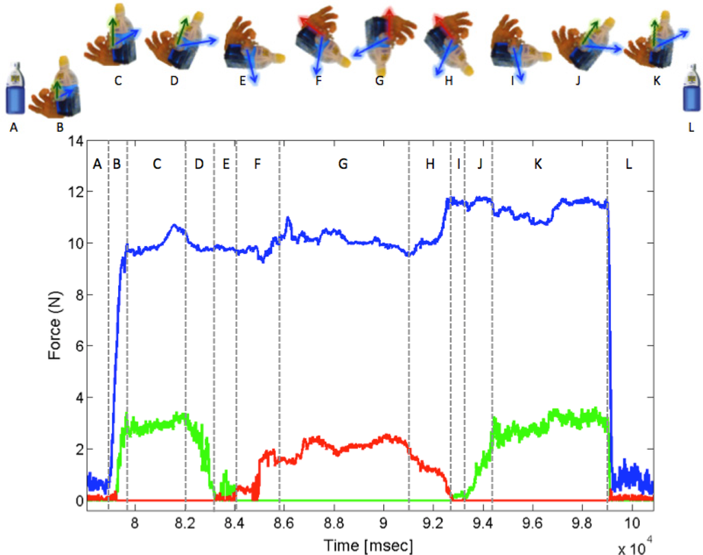 Information provided by thimble sensors is more accurate for detecting flanks than absolute values. Therefore, certain experiments related to performance detecting flanks were undertaken. This subsection summarizes the results obtained in an experiment focusing on the manipulation of a recipient containing liquid. Given the available force information, the task can be segmented into different stages: approximation, contact, grasping, lifting, tilting, and releasing. An example of task segmentation is shown in Figure 9. This figure shows the different stages and the recorded forces when manipulating a bottle containing liquid. First, the user approaches the bottle (A). When the user is in the correct position, he or she grabs the bottle (B) by increasing the force until he or she is able to lift it (C). Then, the user holds the bottle vertically (D) and starts tilting it (E) until the bottle is in a horizontal state. The user continues by tilting the bottle and then tilting it back to the horizontal state (G). Finally, the user holds the bottle vertically again and releases it over the table (I). This information can also be used to create an approximate model of this system [], and results in the reduction of complex model equations that the system must solve in real time and that require high performance computers and Graphic Processing Units (GPUs).