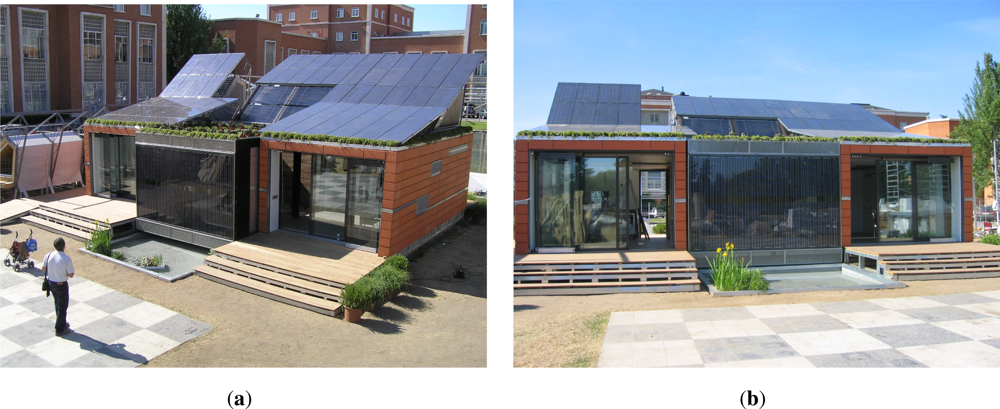 The collaborative sensor network presented in this paper has been developed on a prototype of a self-sufficient solar house called “MagicBox” (see Figure 1). This house integrates sustainability elements based on the use of renewable energies, self-sufficiency energy methods and recycled construction materials. The electric self-sufficiency of “MagicBox” is based on consuming the maximum amount of energy at the same time it is produced, by means of a suitable control system. Moreover, the exploitation of its bioclimatic design reduces the energy needs to achieve adequate comfort levels inside the house [12]. It is an example of added value for PV electricity which arises from the combination of modern hybrid PV technology with a lead-acid battery storage system and DSM strategies in the residential sector. It consists of a 7 kWp PV generator, 7.5 kW grid connection, 9 kWh of lead-acid battery storage capacity with a 5 kWp battery inverter and electricity meters. It includes electrical appliances typical of a highly electrified home. The most consuming ones (i.e., kitchen and laundry appliances) can be remotely controlled using Information and Communications Technologies (ICTs).