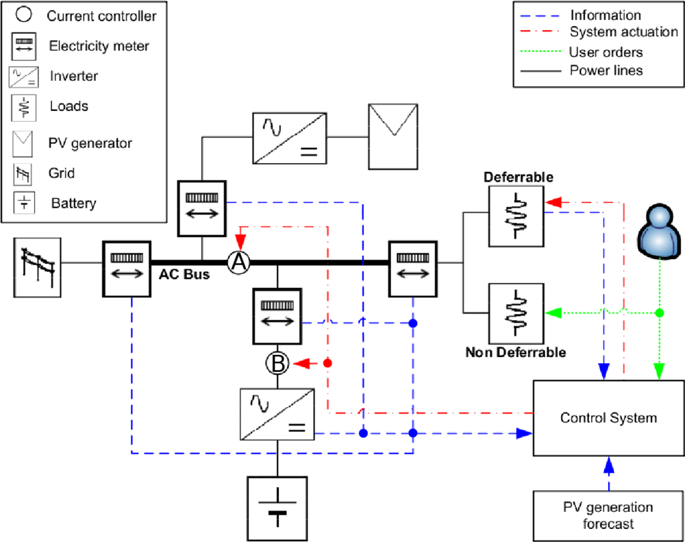 The control architecture is responsible for generating the appliances scheduling and charging/discharging the battery, according to the generation predictions offered by the prediction subsystem, user commands and grid status. It is divided in two controllers: (i) battery controller; and (ii) ADSM controller. Section 5 shows a complete working example of the different controllers. However, a wider description of the controllers is presented in [14].