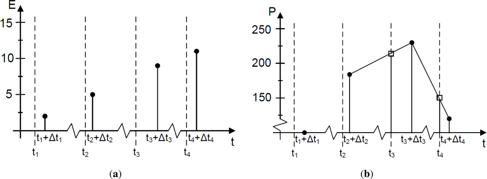 It is necessary to have the power measurements refer to the same time instant in order to perform the energy balances in real time. If we define P[ti] as the power consumption at the requested time, a first order interpolation can be implemented, as shown in Figure 4(b):