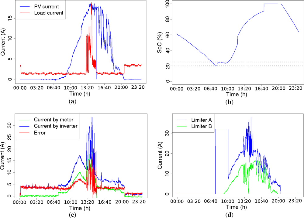 In Figure 5, a battery controller operation example is shown. IPV and ILoads are presented in Figure 5(a). They are the measurements obtained from the meters during an execution day. Clearly, the SoC(%) parameter changes the operation mode of the controller. Its evolution during the same day is depicted in Figure 5(b), the horizontal dotted lines mark the 20%–25% SoC level. Figure 5(c) shows the current measured by the meter and the battery inverter and the difference between them (error). Notice that the error fluctuations are considerable. By using this information the current limiters are set. Their behavior can be observed in Figure 5(d).