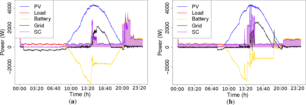 Figure 6 shows the power flows for both experiments and the resultant self-consumed energy. The sign of the different power flows are as follows: the electricity demanded by the loads (in red) is positive, the generated electricity (in blue) is positive, the flow of power in the battery (in yellow) is positive when discharging to the loads and negative when charging from the excess of PV generation, and finally the power of the gird (in black) is negative when it supplies electricity to the loads and positive when the local energy excess is exported to the grid (in a full-charge situation and PV generation excess). The self-consumed electricity (in purple) represents the flow of demanded power that is supplied by local sources of energy. Notice that the electricity demanded (in red) agrees with the self-consumed electricity if there is enough PV electricity or energy in the battery, thus both lines are overlapped.