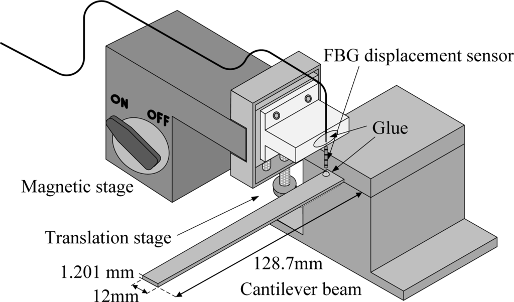 To set up an FBG as an out-of-plane FBG displacement sensor, one end of the FBG displacement sensor is glued to a vertical translation stage and the other end of the FBG is glued to the sensing point on the surface of the cantilever beam with a mix of epoxy resin and hardener. Since FBGs are very sensitive to the longitudinal strain, the set-up method mentioned above allows an FBG to be capable of measuring the out-of-plane dynamic displacement of the cantilever beam with high sensitivity. The illustration of the set-up method for the proposed FBG displacement sensor is shown in Figure 1. Details regarding the FBG displacement sensor set-up method can be found in Chuang and Ma [6].