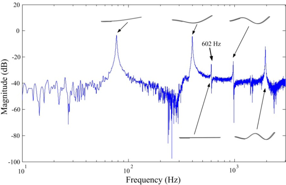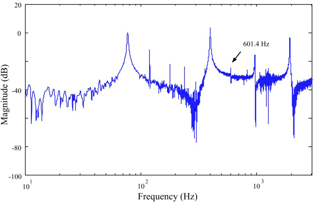 From both Figures 10 and 11, we can see that a lateral mode (i.e., 602 Hz in Figure 10 and 601.4 Hz in Figure 11) is measured by the two sensors. However, frequency response obtained by the conventional strain gauge (i.e., Figure 11) contains more measurement noises especially between the first and the second bending modes of the smart cantilever beam. The identified first three bending modes of the smart cantilever beam without the presence of the steel ball are 76 Hz, 400 Hz, and 975 Hz, respectively. Since the error between the first resonant frequency is quite small, it is acceptable to say that the resonant frequencies can be obtained from the impact-induced transient responses. However, for the purpose of active vibration control, the first bending mode of the smart cantilever beam is considered to be 76 Hz in this work.