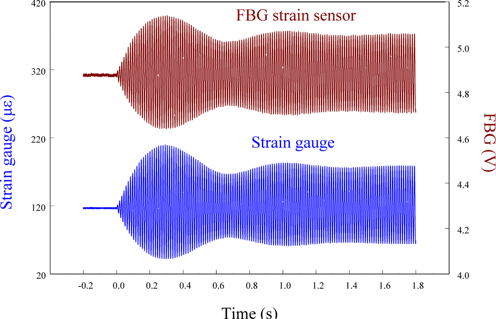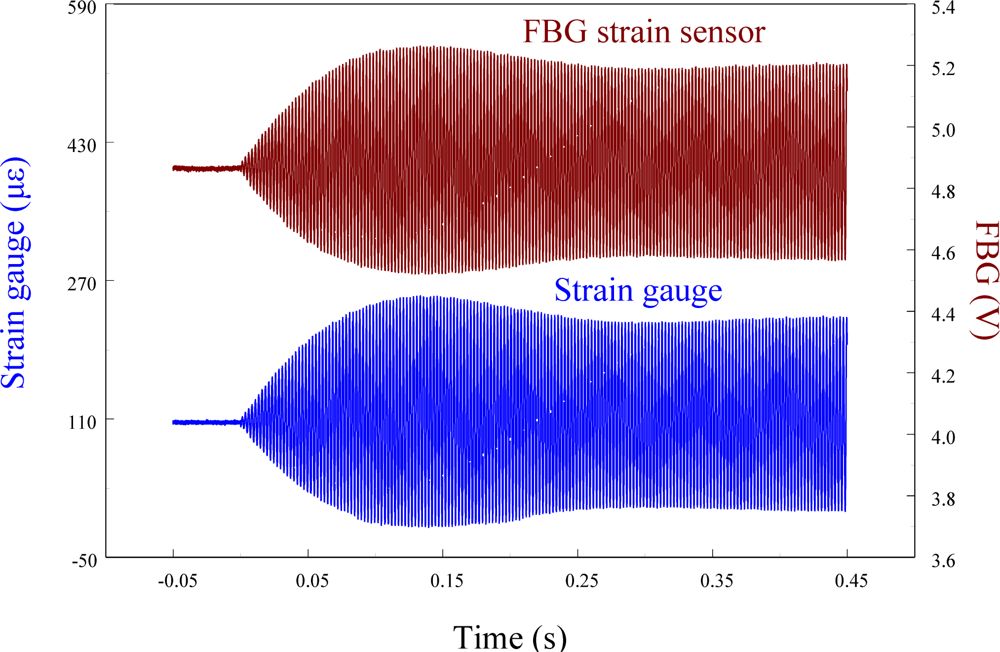 We further investigate the dynamic demodulation ability of the FBG filter and the response time for the piezoceramic actuator to achieve the steady state vibration condition. The smart cantilever beam is excited by the piezoelectric actuator at the first resonant frequency (76 Hz) and the second resonant frequency (400 Hz). Figure 12 demonstrates the dynamic strain from transient response to steady state of the smart cantilever beam excited at 76 Hz.