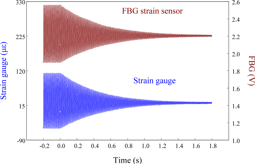Figure 14 shows the sensing results obtained from two strain sensors simultaneously when the smart cantilever beam vibrates freely after excitation at 76 Hz is removed.