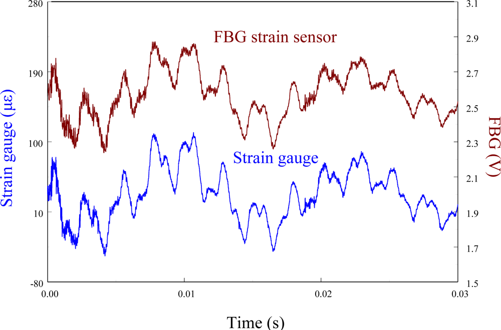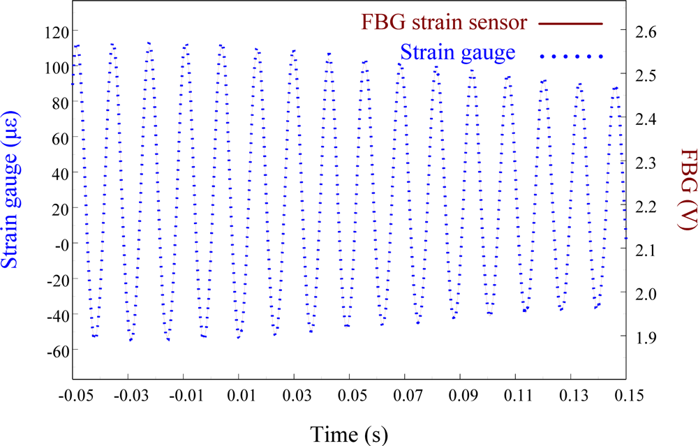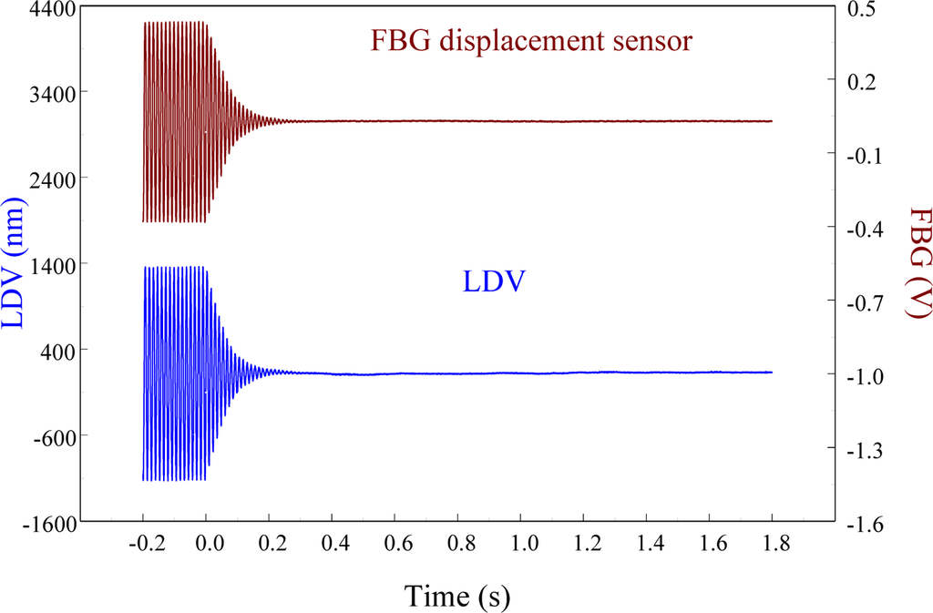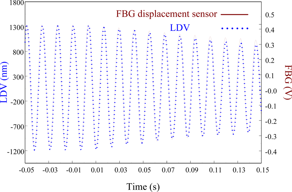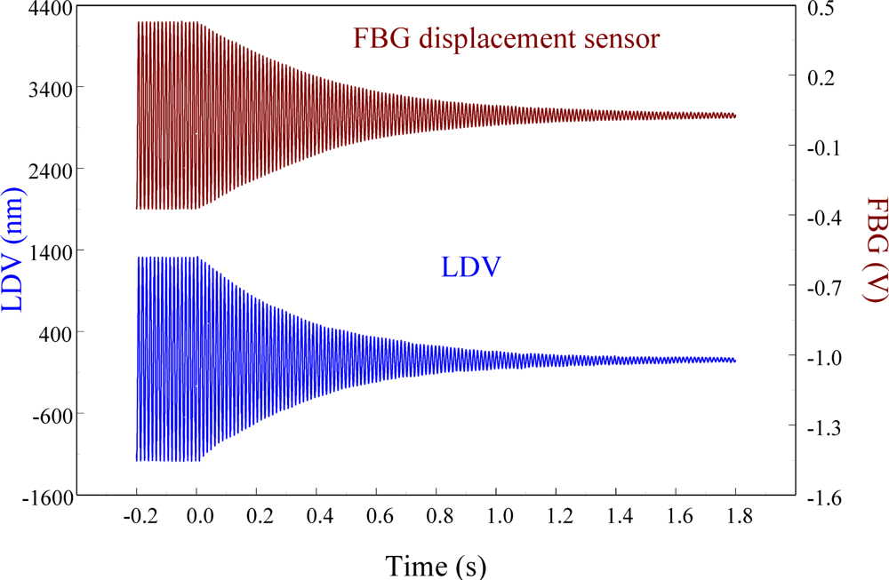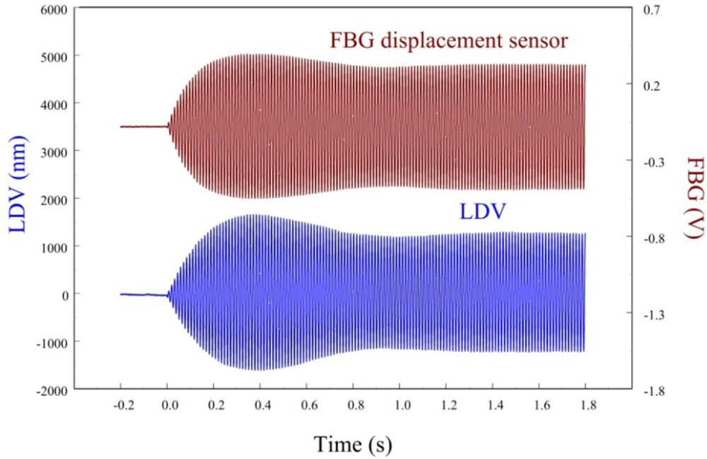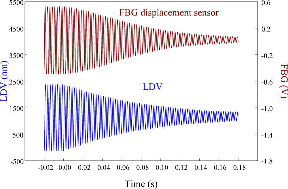 Figure 23 zooms in on the responses in Figure 22 and focuses on the responses within a span of 0.2 s, showing excellent agreement between two displacement sensors. The maximum peak to peak value of LDV is 2,506.44 nm. Thus, the sensitivity of the proposed FBG displacement sensor is 0.321 mV/nm by calibration with LDV.