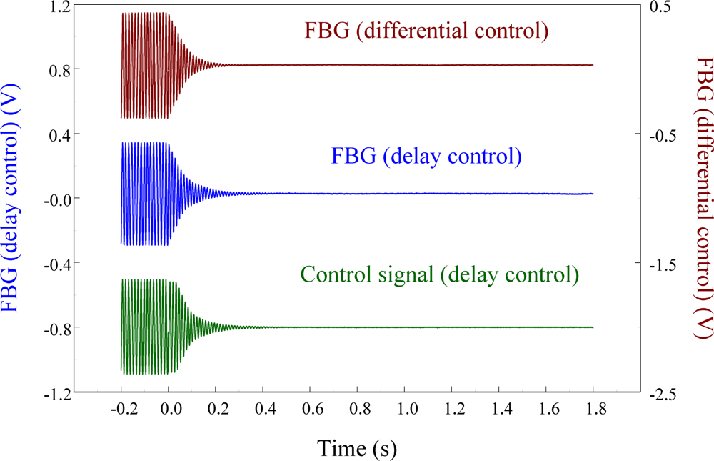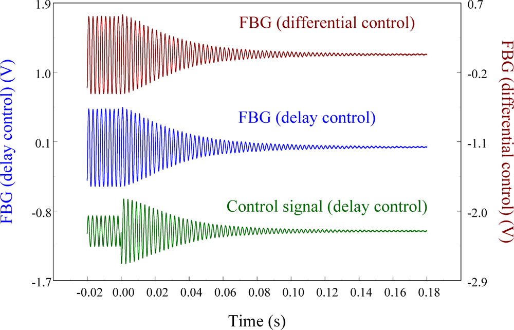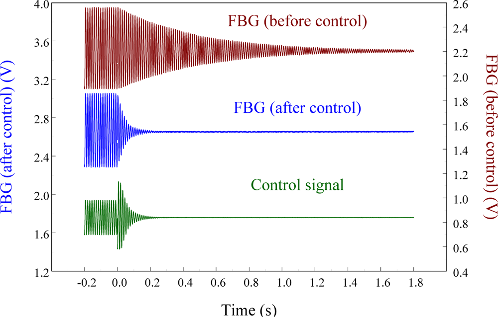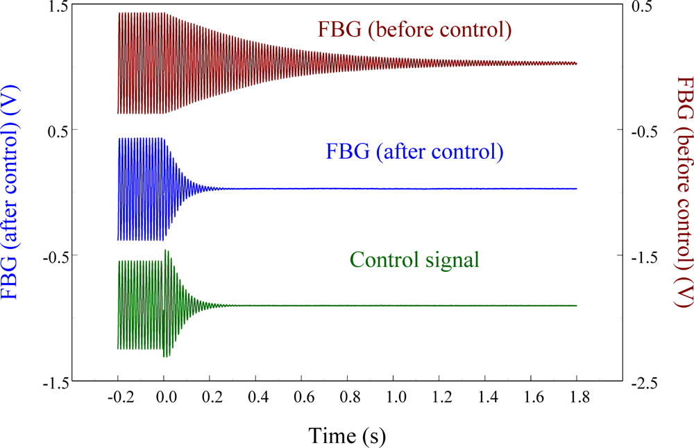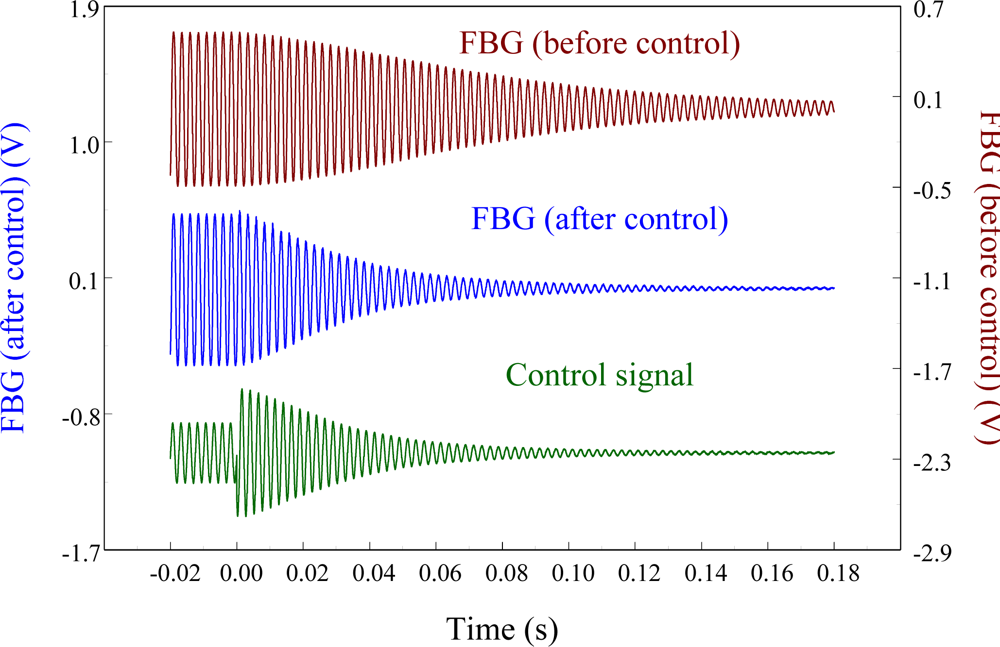 Figure 15 overlaps the two results and focuses on the responses with a span of 0.2 s. Since the responses measured from these two strain sensors correspond excellently with each other, we can again see that the FBG filter is capable of demodulating responses obtained from the FBG sensor dynamically. Finally, to see the demodulation effect of the FBG filter in an active vibration control system, the negative velocity feedback controller is utilized. As shown in Figure 16, with response before control and the control signal as comparisons, the control result obtained from the FBG strain sensor approaches to zero at about 0.3 s. Since the control effect shown in Figure 16 agrees well with the prediction that the velocity feedback can add damping of the cantilever beam, the dynamic demodulation performance of the FBG filter in an active vibration control system is demonstrated.