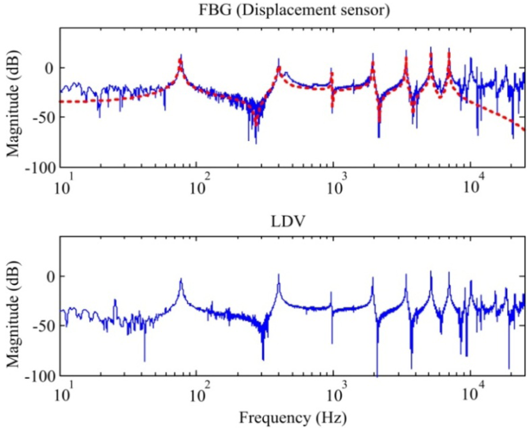 Now we can focus on the dynamic sensing performance of the proposed out-of-plane FBG displacement sensor. First, we perform the system identification of the smart cantilever beam again by the stochastic spectral estimation with the FBG displacement sensor and a non-contact laser Doppler vibrometer (LDV). Since the LDV has high sensitivity and resolution, its measurement results are used for comparisons with the results obtained by the FBG displacement sensor. The obtained frequency responses obtained by the two sensors are shown in Figure 17. A fourteenth model obtained from the concept of constructing the Bode plot is obtained and represented as dashed lines, as shown in Figure 17. Thus, we can see that the proposed FBG displacement sensing system can be utilized to perform system identification for the smart cantilever beam. In Figure 17, the frequency responses obtained by the FBG and LDV agree well with each other except for the low frequencies below the first bending mode. In fact, the discrepancies for low frequencies are due to the length of the random inputs recorded in the computer.