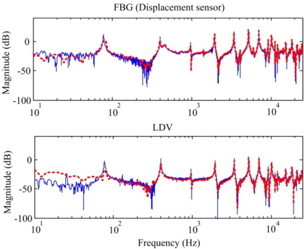 To see this effect, we excite the piezoelectric actuator again with shorter random inputs (only last for 1 s), the results obtained by the two displacement sensors are represented in Figure 18 as dashed lines. Compared with the identified frequency responses (i.e., solid lines shown in Figure 18) with longer random inputs (last for 10 s), we can see that identified modes are almost the same except for the low frequencies. Repeatability of our experimental setup and the proposed FBG displacement sensor can be demonstrated in Figure 18 for frequency contents at high frequencies.