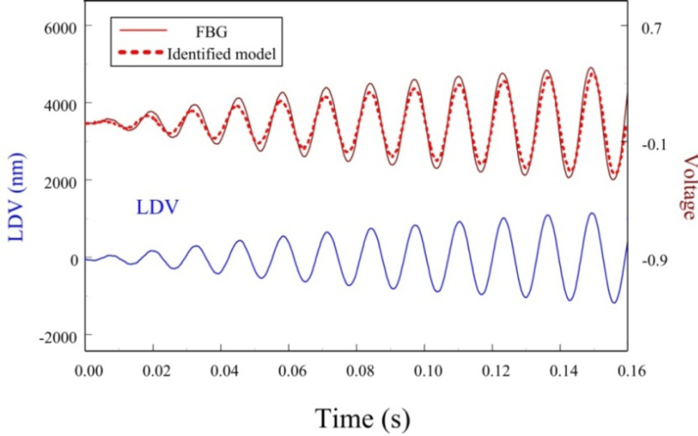 In this paper, only the first two bending modes of the cantilever beam are considered and controlled by velocity feedback control. Similar to strain experiments, we also investigate dynamic sensing performances of the proposed FBG displacement sensor by measuring transient responses of the smart cantilever beam after being excited at the first two bending modes. Figures 19 and 20 are the measurement results when the smart cantilever beam is excited at 76 Hz and 400 Hz, respectively. Figure 21 demonstrates the experimental results obtained by the two displacement sensors and simulation result obtained from the identified model of the smart cantilever beam. Compared with LDV in Figures 19 to 21, we can see that the proposed FBG displacement sensor has excellent dynamic sensing performance. From Figure 21 we can also see that the proposed FBG displacement sensor is capable of being employed to perform system identification for the flexible structures.