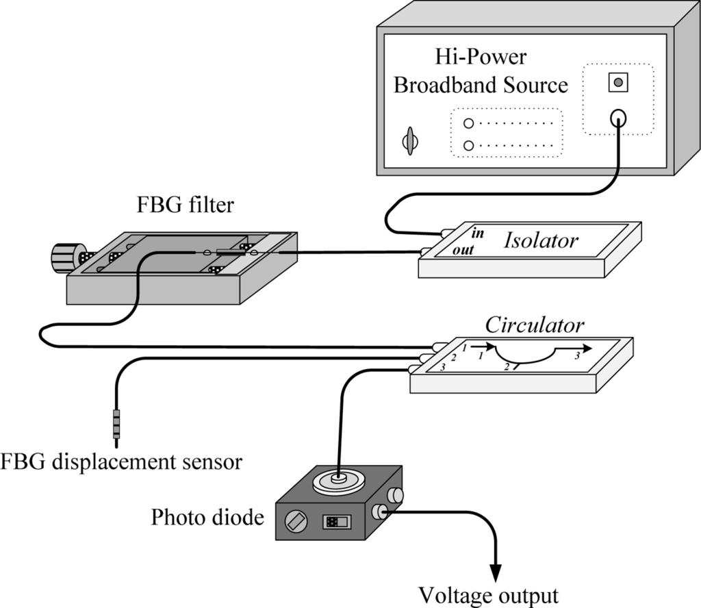 Before performing the measurement, calibration of the FBG sensing system is necessary to ensure the linearity, maximum sensing output, and sensitivity. The calibrating criteria are based on the demodulation behavior of the FBG filter. The transmittance of the FBG filter can be approximated by [14–16]: