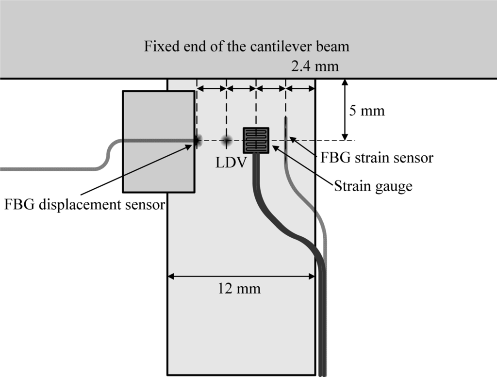 A traditional FBG strain sensor and a strain gauge are also used to verify the performance of the FBG filter before performing the experiments for the FBG displacement sensor. The sensing locations of the FBG displacement sensor, LDV, FBG strain sensor, and strain gauge are shown in Figure 6.