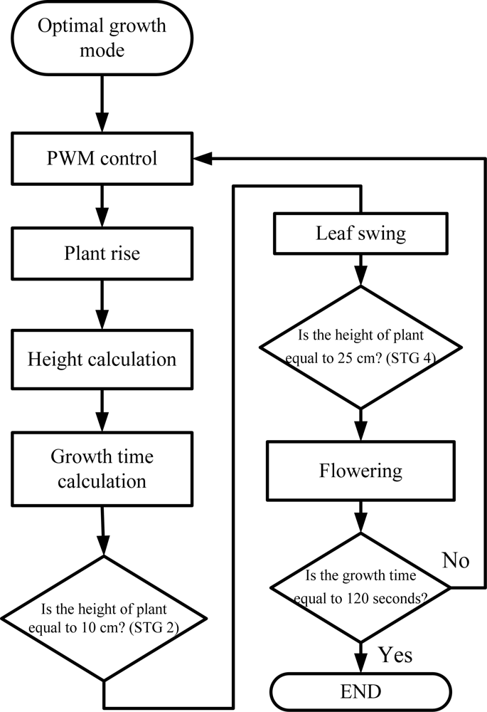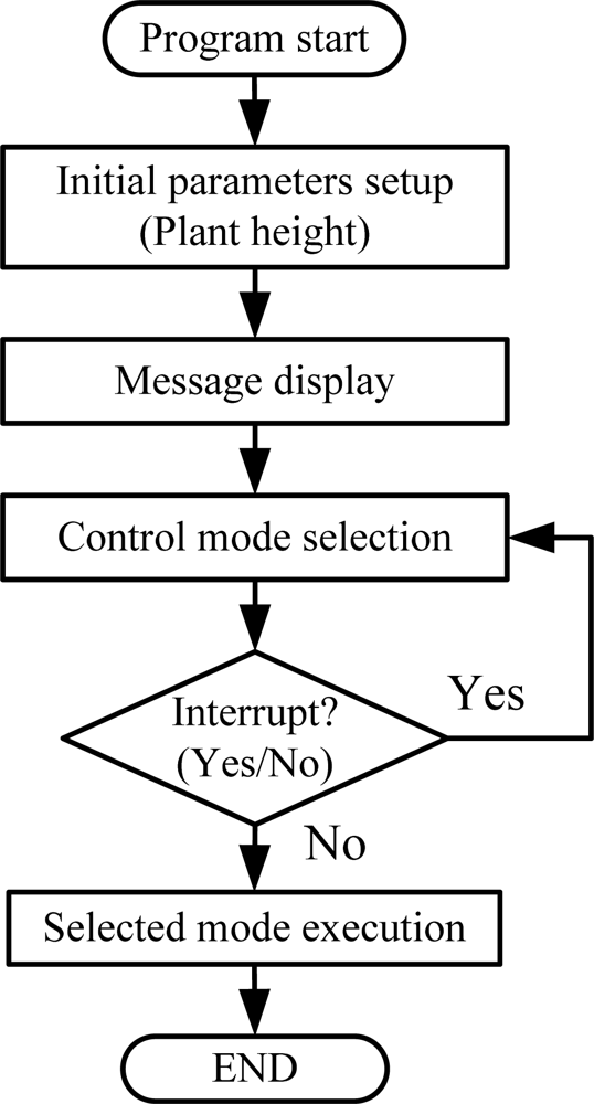 Figure 8 depicts the flow chart of the main program. When the system power is on, the system restarts, initializes, and the internal parameter is to be setup within the controller. Firstly, the parameters of plant height, amount of light, temperature, humidity, and the growth stage are initialized. The status information of the system is to be displayed on the screen of PC and then the system enters standby mode.