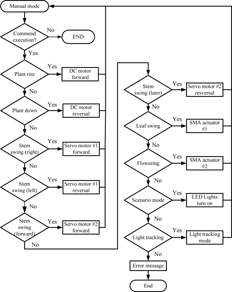 Jump_Manual: To execute the manual function. The main purpose of this function is to prevent the occurrence of emergencies. Meanwhile, the function is also used to test each growth modes for the bio-botanic robot. Figure 12 depicts the flow chart of program of “Jump_Manual”.