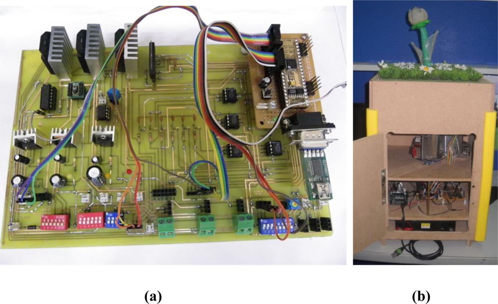 This chapter demonstrates the experiment test results of our bio-botanic robot. Figure 13 shows the self-designed embedded board and experimental equipment. The embedded development board integrates the required modules for BRPS to execute each function, which includes power supply module, main-controller, sub-controller, random access memory (RAM)/read only memory (ROM) modules, DC motor driver module, motor encoder module, SMA driver modules, temperature/humidity sensors modules, light sensors modules, and universal serial bus (USB) communication module. The BRPS consists of plant base, embedded board, micro-controller, and is contained within the pot.