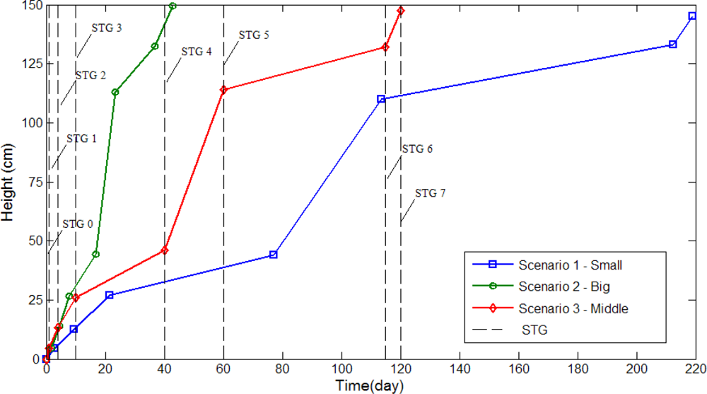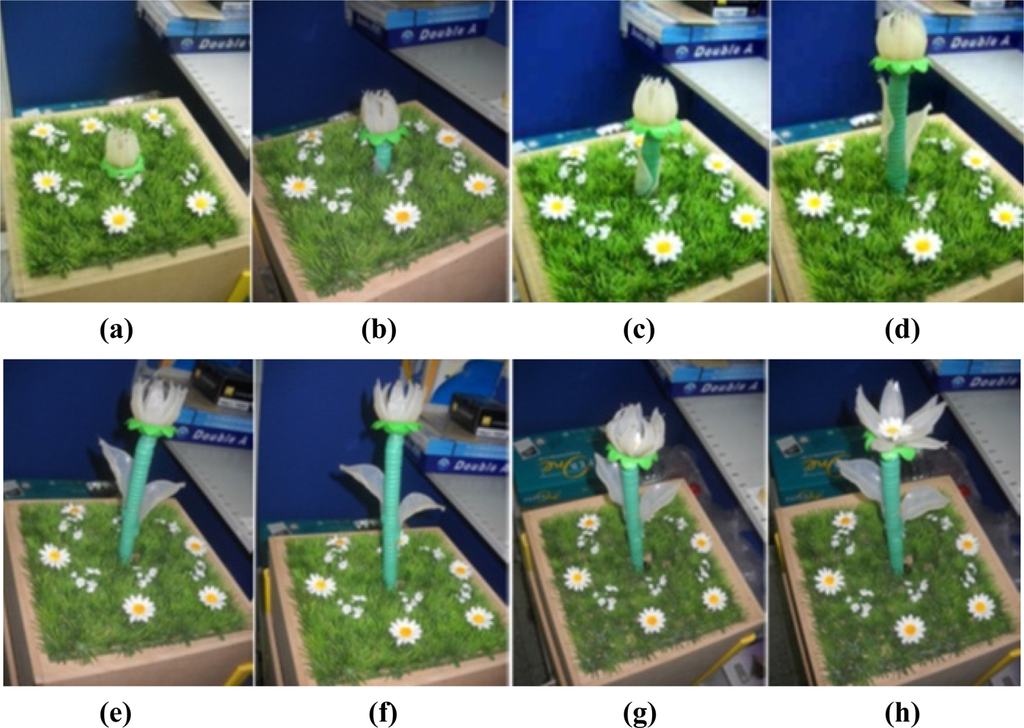 Three different growth modes are considered in these experiments. Different parameter settings allow observation of changes in growth rate and environment factors are regulated by the fuzzy controllers. Figure 14 the depicts status of plant growth, which is divided into eight stages shown as follows (first scenario): (a) STG0 stage; (b) STG1 stage; (c) STG2 stage; (d) STG3 stage; (e) STG4 stage; (f) STG5 stage; (g) STG6 stage; (h) STG7 stage. Figures 15 and 16 illustrate the growth curve of BRPS and real plants. The two figures show that the experiment of growth height under three different environmental factors almost resembles the growth process of real plants. It shows that the proposed BRPS can mimic the plant growth based on different environmental factors. Figure 17 demonstrates the flowering stage (STG6) of the robot for three scenarios.