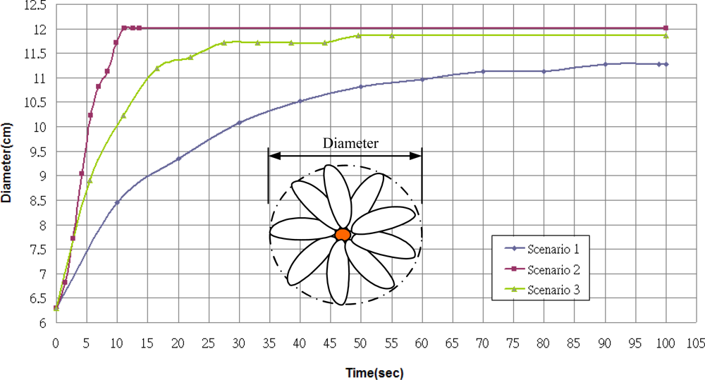 The parameter setup of the spring is based on the actual shape and weight of a real sunflower to give setup values of different ratio. The diameter of sunflower stems vary according to their variety and is typically about 10∼25 mm. The height of plants is 1.5∼3 m and the diameter of the faceplate at maturity is about 80∼120 mm. The weight of receptacle and leaf is roughly 68 g. The diameter of plant, growth height and weight can help calculate the proper specifications of the spring.