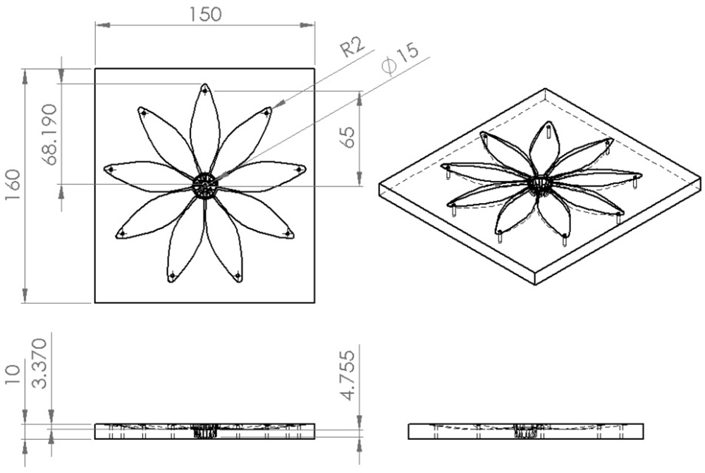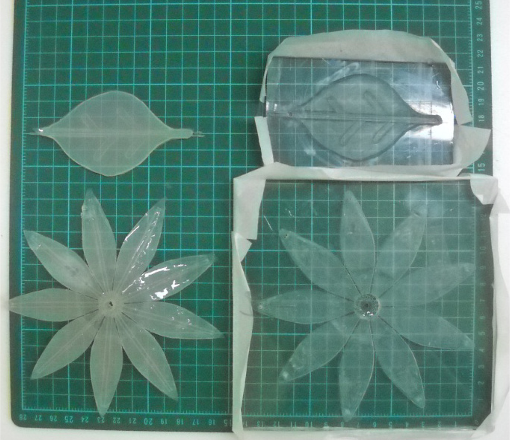The PDMS material of leafs and petals can withstand the heat produced from the driving SMA. The silicone design process consists of six steps: (1) design of the mold for leaves and petals; (2) carved molding; (3) ratio blending of silicone and hardener; (4) mixing, pouring into template and pumping under vacuum; (5) placment under regular temperature for hardening; (6) template demolition and cutting of the silicone mold. Figures 3 and 4 depict the mold size of leaves and petals. Figure 5 shows the leaf and petal templates and the work after infusion molding.