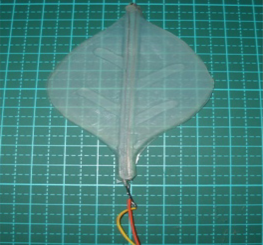 Because the stems of leaves and petals are tinier, the spring cannot be utilized to swing in order to mimic a realistic effect. Thus, SMA is adopted to overcome this drawback. The SMA material serves as a blade branch. It can retain shape memory after heating. Thus, we utilize the characteristics of SMA to construct the leaves (petals), which results in the desired swing phenomenon. Firstly, the processed SMA is implemented in the silicone leaves. Second, the actuator that can control SMA is designed. The pulse width modulation (PWM) technique is employed to control the curvature of SMA and have the tip of leaf present displacement. Meanwhile, a thermal imager is adopted to analyze the generated temperature value of SMA under different voltages, which can help investigate the relation between the swings of leaves and petals of the bio-robot and the output voltage of the micro-controller. This can yield the optimal swing quality. Reference [30] describes the process in detailed. The final product is shown in Figure 6.