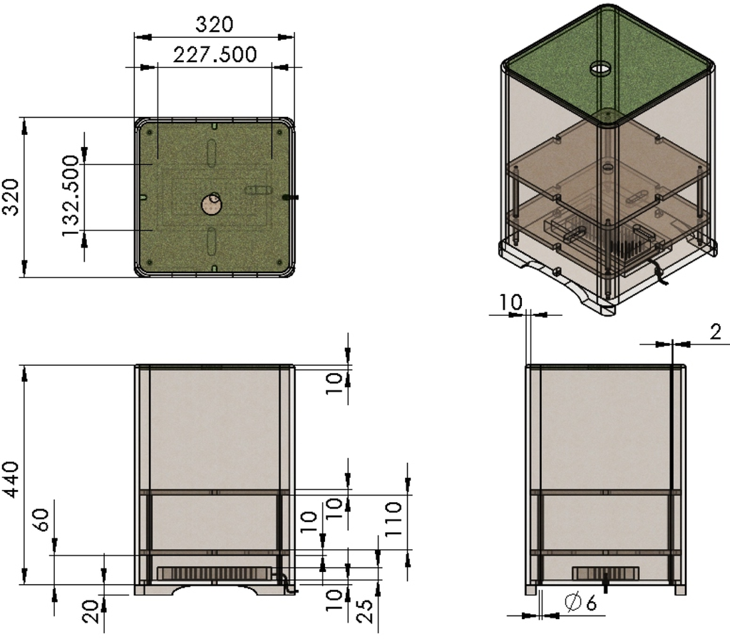 The design specifications of the pot are presented in Figure 7, where the units are in mm. The pot consists of three layers. The bottom layer is used to place the controller and the peripheral modules of hardware system, etc. The middle layer is for the servomotor. The top layer is for the plant mechanism. The pot is covered with a clapboard and turf, which can add some sort of atmosphere.
