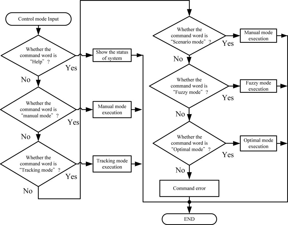 Two types of command are executed in the bio-botanic robot. The first one is to select growth mode, which includes the optimal growth function, fuzzy growth function, and manual function. The second type is scenario mode that consists of light tracking function and light scenario function. Figure 9 depicts the flow chart of the control process.