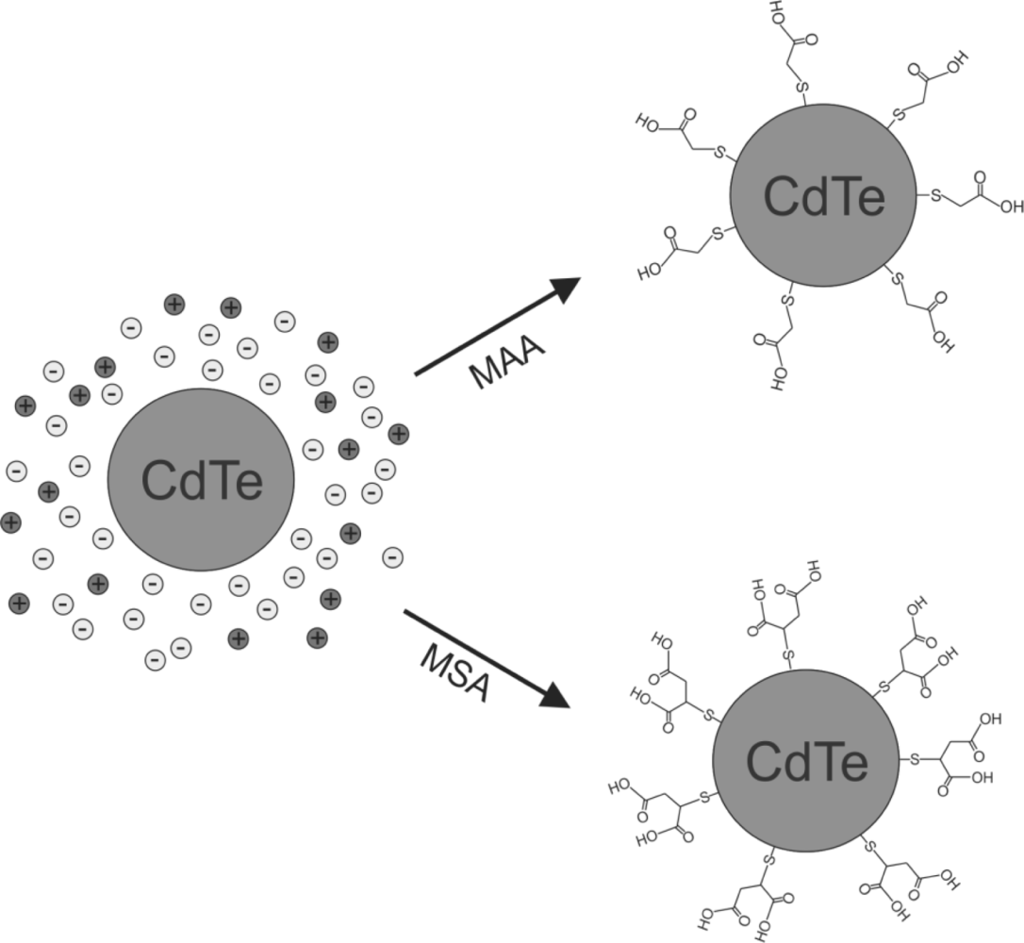 QDs can be capped with chemically inert materials such as silica to protect the cell and the QD, avoiding both cell cytotoxicity, and chemical and/or metabolic degradation of the QD labeling inside the cells []. Moreover, QDs passivation or functionalization with thiol molecules [–] can be used as a universal bioconjugation. For example, mercaptoacetic acid (MAA), and mercaptosuccinic acid (MSA), link the thiol (-SH) termination with the CdTe QD, forming a small passivation layer of CdS around the nanoparticle. On the other hand, MAA also acts as a functionalization layer due to the affinity of OH radical with terminal amino groups in proteins [,] (see Figure 1).