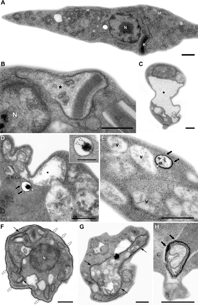 Figure 3, the ultrastructural analysis of epimastigotes incubated with 200 μM QDs, shows: (a) intense vacuolization in the cytosol; (b) mitochondrial swelling; (c) the appearance of endoplasmic reticulum profiles surrounding organelles and other cytosolic degraded structures. The presence of the nanoparticle could be observed inside the cytosolic vesicles and also on epimastigote surface. Stahl and co-workers (2011) also observed that parasites incubated with 2 μM CdTe QDs presented the integrity of cellular organelles such as mitochondria, nucleus, Golgi apparatus and plasma membrane similar to the untreated groups []. Such concentration was sufficient to label the epimastigotes and was not toxic, at least up to 72 h, reinforcing the possibility of several applications of QDs in these parasites. We also described several morphological alterations, in a previous study, especially indicative of autophagic process. This raised the possibility that high concentrations of QDs on the parasite surface could lead to autophagy by an unknown pathway, a question that has not been answered yet. The observation of QDs in membrane vesicles and extensive changes in the plasma membrane near the flagellar pocket region suggests a membrane shedding, without any disorganization in the subpellicular microtubules cage []. Some membrane blebbing induced by QDs was also described in bacteria [].