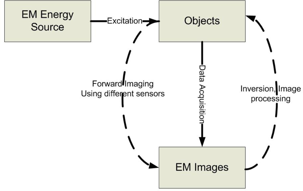 The development of imaging techniques for investigating physically inaccessible objects has been a topic of research for many years and have found widespread applications in the field of nondestructive evaluation (NDE) [1]. All electromagnetic (EM) methods in nondestructive evaluation involve Maxwell’s equations and cover a broad range of the electromagnetic spectrum, from static or direct current (DC), such as magnetic particle method, to high frequencies, e.g., X-ray and gamma-ray methods. Imaging, simply speaking, is the formation of images. Imaging science is concerned with the formation, collection, duplication, analysis, modification, and visualization of images. Electromagnetic NDE imaging is essential for detecting anomalies or defects in both conducting and dielectric materials by generating two-dimensional (2D) or three-dimensional (3D) image data based on the electromagnetic principles. A generic EM NDE imaging system can be simply represented as shown in Figure 1. For the forward imaging approaches, the excitation transducers usually couple the EM energy into the test objects, while the receiving sensors measure the response of energy/material interaction. Depends on different energy types and/or levels, various EM sensors/transducers can be used for a broad range of applications, e.g., eddy current imaging, microwave imaging, terahertz imaging, etc. After acquiring and storing the EM images, those data are passed through the inversion techniques block, which involves the object reconstruction, pattern recognition, etc. [2].