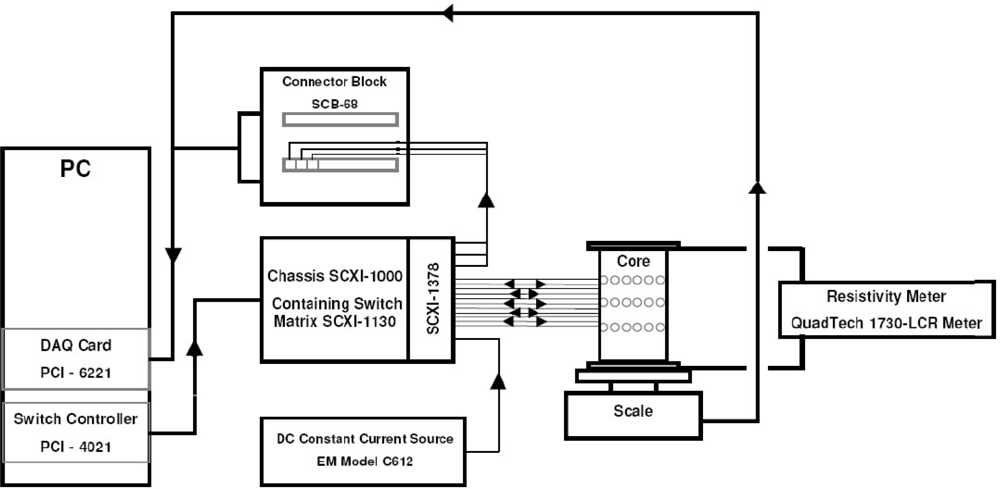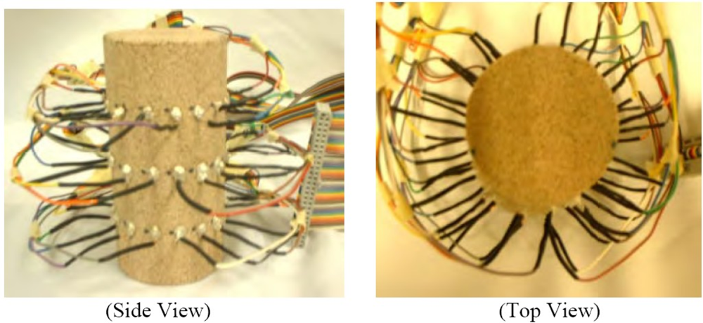 In the authors’ point of view, the three-dimensional EIT imaging is still in its infancy for nondestructive evaluation purposes. Stacey et al. at Stanford University published a technical report in 2006 on 3D EIT imaging that provides estimates of reservoir saturation at multiple scales by determining the resistivity distribution within the subsurface [22]. Although their system is limited to specific applications, their initial experimental results are promising, which used a Berea sandstone core with 48 electrodes attached in three rings of 16. The side and top view of electrode design is shown in Figure 9 and the EIT imaging system schematic is illustrated in Figure 10. To summarize their system, the voltage potential field was measured by applying a direct current pulse across the core and measuring the voltage potential at all electrodes, essentially applying the 4–wire resistance technique over all electrodes in turn. The PC cycles through the sequence by measuring the voltage potential at every electrode before changing the current source electrodes. The current is supplied by the data acquisition (DAQ) card. The scale and resistivity meter are used to calibrate the EIT measurements by providing the actual saturation and resistivity [22]. EIDORS toolkit, which was developed for applications to nonlinear and ill-posed inverse problem, was utilized. Experiments conducted by Stacey et al. have indicated that 3D EIT is a viable technique for studying the displacement characteristics of fluids with contrasting resistivity and is capable of detecting displacement fronts in near real-time. Again, in our perspective, EM tomography imaging techniques have been underestimated in NDE community and should be exploited more in future. More discussion will be conducted in the last section of this paper.