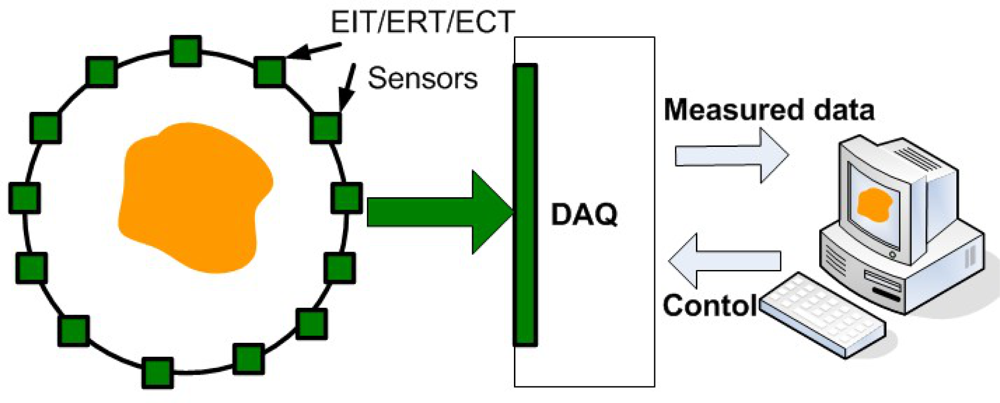 In contrast to EIT and ERT, electrical capacitance tomography (ECT) imaging attempts to image the permittivity distribution of an object by measuring the electrical capacitances between sets of electrodes placed around its periphery. Yang et al. reviewed the existing image reconstruction methods for ECT, including linear back-projection, singular value decomposition, Tikhonov regularization, Newton–Raphson, iterative Tikhonov, the steepest descent method, Landweber iteration, the conjugate gradient method, algebraic reconstruction techniques, simultaneous iterative reconstruction techniques and model-based reconstruction [23]. Figure 11 shows a typical EIT/ERT/ECT system with an multiple electrode sensor.