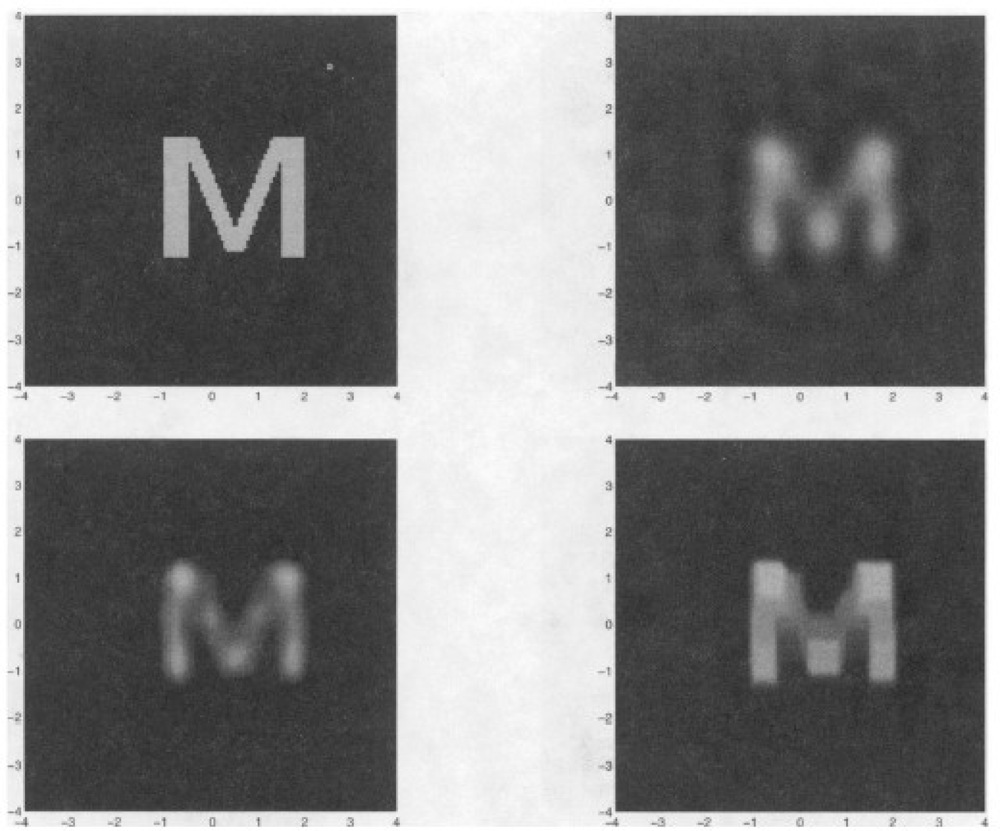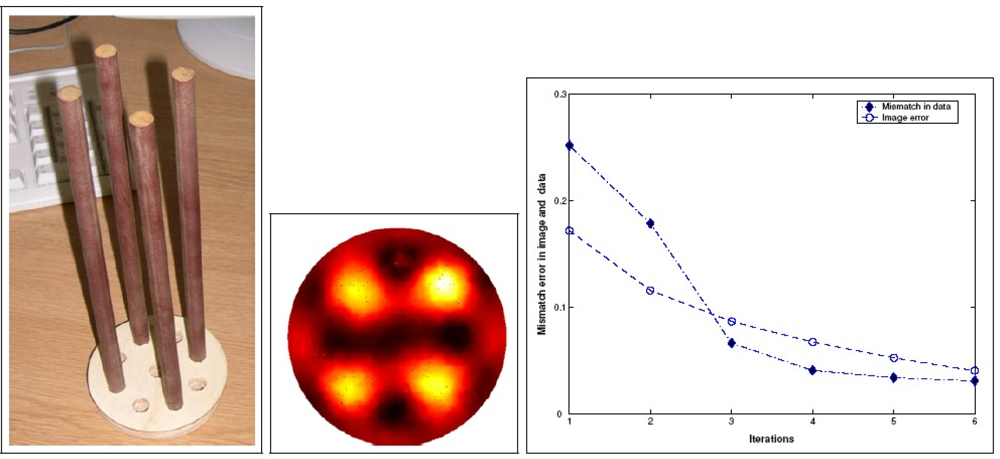In addition to Yang’s comprehensive review paper on ECT reconstruction, Soleimani et al. studied the nonlinearity of the inverse permittivity problem of ECT and implemented a regularized Gauss–Newton for nonlinear image reconstruction with adoption of finite element method(FEM) as the forward model solver [24], recently in 2005. The ECT results of four plastic rods is shown in Figure 12. Soleimani and colleagues presented a Helmholtz type Regularization Method for ECT reconstruction in 2010 [25]. More recent literatures on ECT development can be referred to [26,27] and [28].