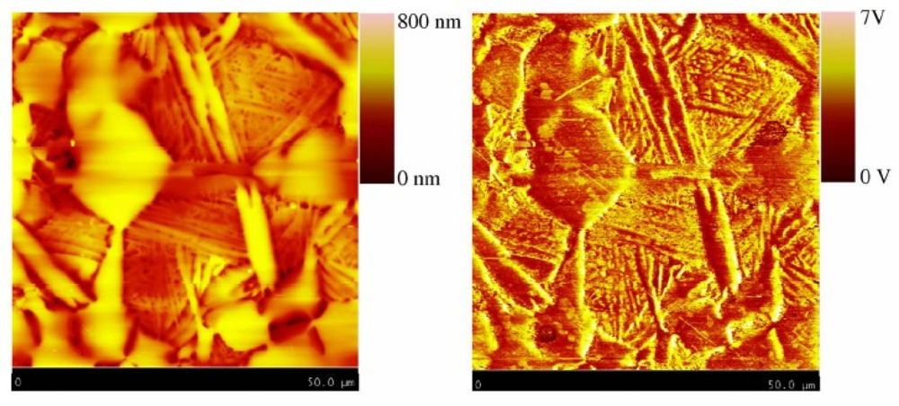 In 2008 and 2009, Nalladega et al. published an interesting paper and his doctoral dissertation [45], respectively, on a high resolution electrical conductivity imaging technique based on the principles of eddy current and atomic force microscopy (AFM). In the imaging system that he proposed, an electromagnetic coil is used to generate eddy currents in an electrically conducting material. The eddy currents generated in the conducting sample are detected and measured with a magnetic tip attached to a flexible cantilever of an AFM [46]. The contrast in the image was explained based on the electrical conductivity and eddy current force between the magnetic tip and the sample, where the spatial resolution of the eddy current imaging system was determined by imaging carbon nanofibers in a polymer matrix. The schematic of this high resolution eddy current microscopy is illustrated in Figure 16 with imaging results shown in Figure 17 [47].