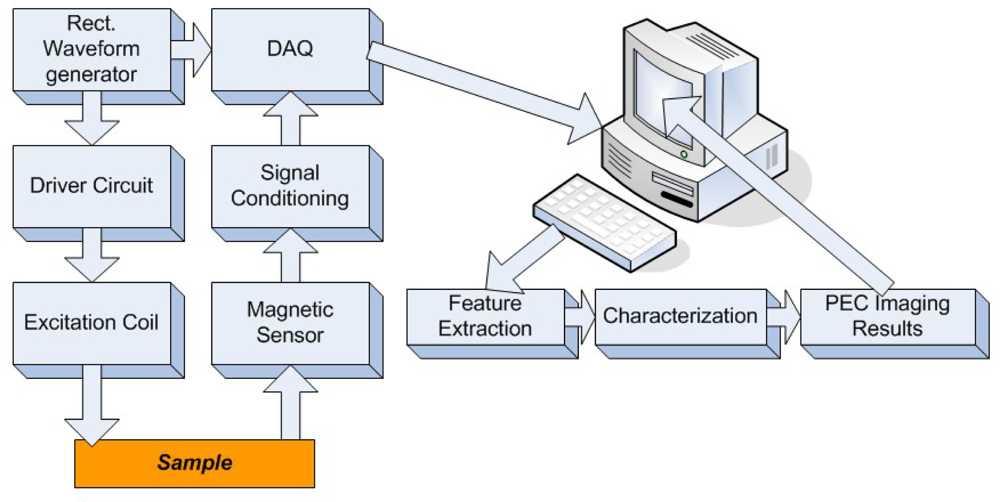 The early pulsed eddy current sensors usually extracted defect information from the peak values and temporal profiles of the signals. Tian et al. proposed a prototype of pulsed eddy-current imaging with multiple sensors and used the principal component analysis (PCA)-based feature extraction that provides orthogonal information [51]. The schematic of a typical PEC imaging system is shown in Figure 18.